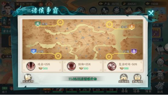 诸侯争霸为跨服GVG限时活动,本活动需跨服内多个区服共同参与,以服为单位随机分配阵营参与角逐,活动期间主要占领城池等获得积分进行排名,并获得对应奖品。