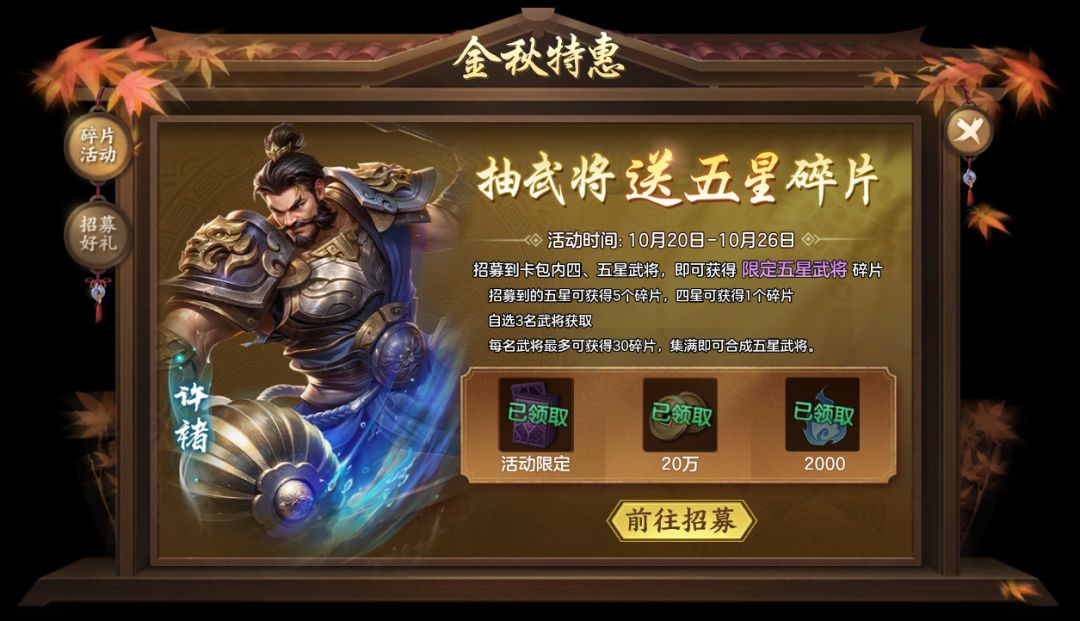 活动期间,玩家在活动限定卡包内招募到四、五星武将即可获赠武将碎片。招募到四星武将可获得1个自选五星碎片,招募到五星武将可获得5个自选五星碎片。