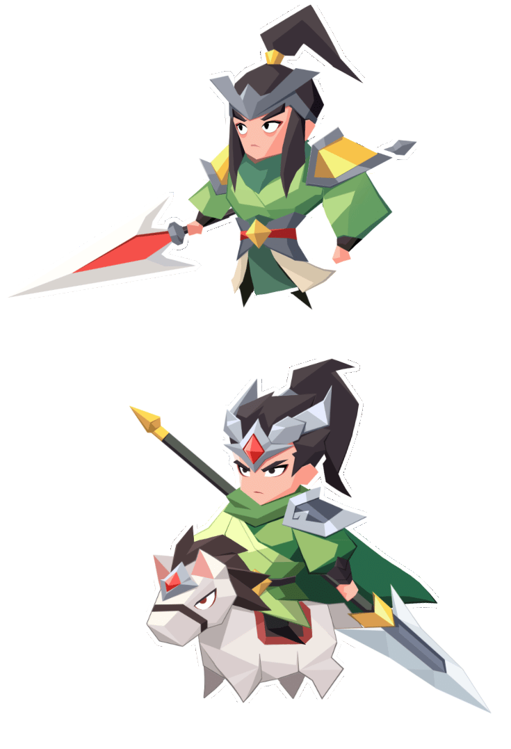 初版设计 · 孤高的“多边形战神”当初,我们想打造一个极简、冷峻的赵云。去掉战马,让他每一个棱角分明的几何块面都更突出,像一柄出鞘的利剑,冷静又锐利。理念就一个字:“飒”! 突出他单枪匹马、一身是胆的决绝(就是眼神有点呆萌~..~)。