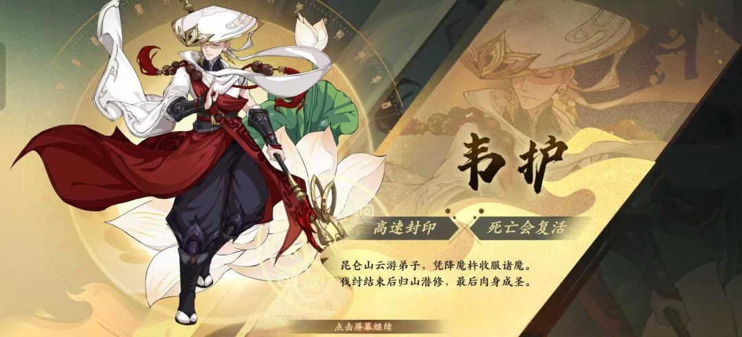 封印伙伴:韦护(被动阵亡后复活)、青丘狐仙(被动免疫一次致命伤害)