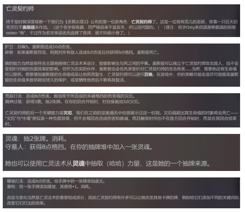 《杀戮尖塔 2》最新特报公布首位新角色 —— 亡灵契约师,这位巫妖风格角色以死灵巨手奥斯提为核心作战伙伴,机制围绕亡灵法术展开。