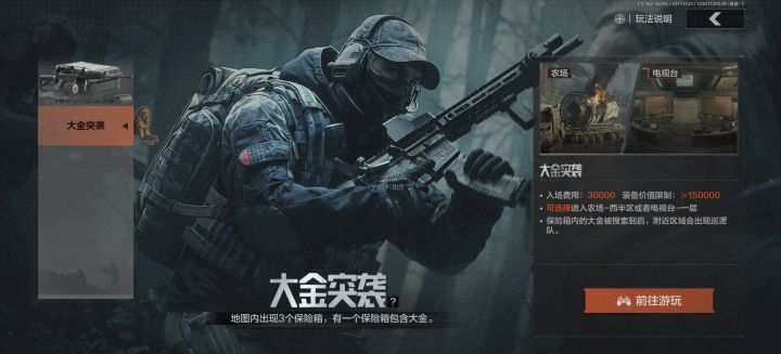 “大金突袭”作为《暗区突围》热门限时模式,以高集中物资和紧凑节奏成玩家焦点。其入场需3万柯恩币及15万以上战备值,地图锁定农场西半区、电视台一层等小图,单局仅20分钟,节奏极快。