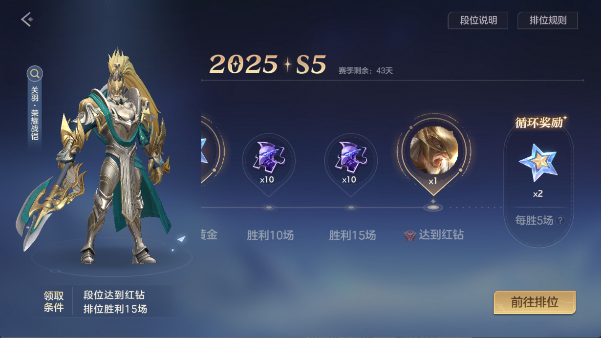本赛季达到红钻段位,即可免费领取史诗皮肤——关羽·荣耀战铠!