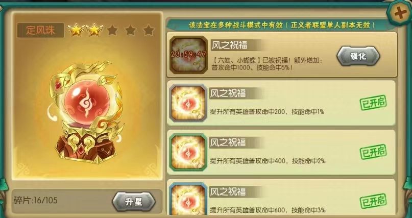 赐福加成:七星定风珠六娃、蝴蝶;七星补天石大娃(镇妖之灵)、七娃(虚天之灵)。
