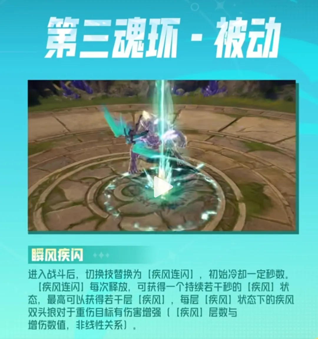 然后3被动就有点意思了,可以看作是风笑天的一个核心机制,其可以直接把风笑天的先机技能给替换为疾风连闪,看这个描述的意思是通过不断释放这个先机技能风笑天便可以积累“疾风”状态,此状态层数越高则起对于“重伤”敌人的输出也就会越高,当然这里还有一个理解就是可以给重伤敌人进行增伤?