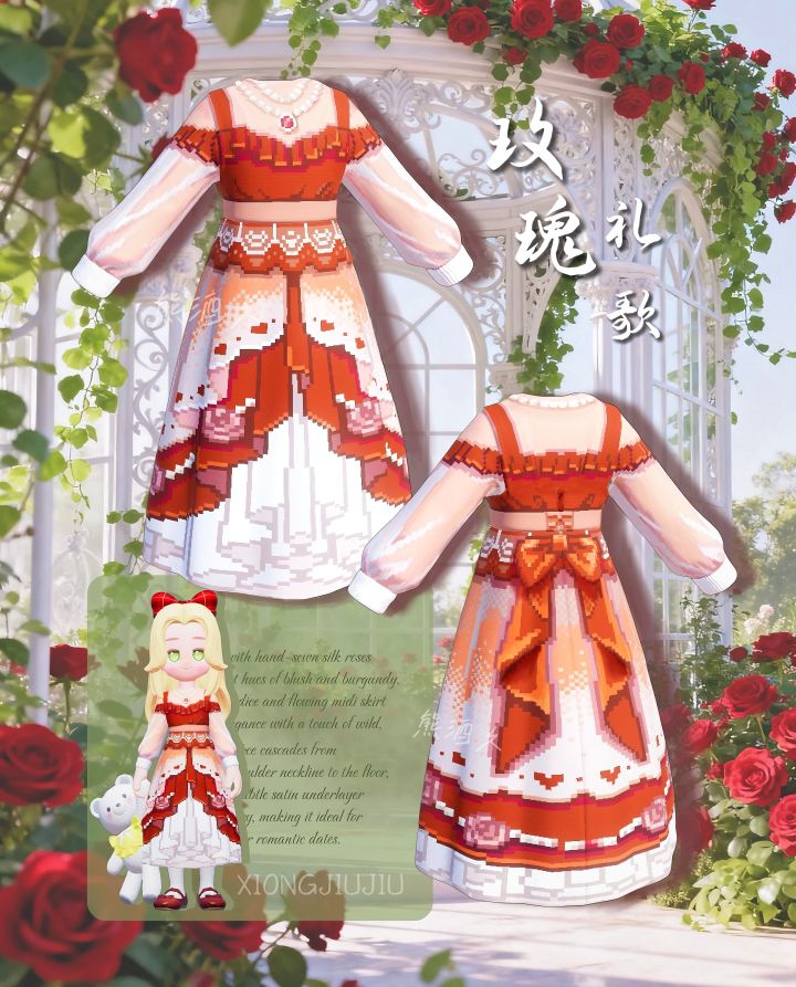 以“开心”为主题设计的橙红色主调玫瑰长裙。