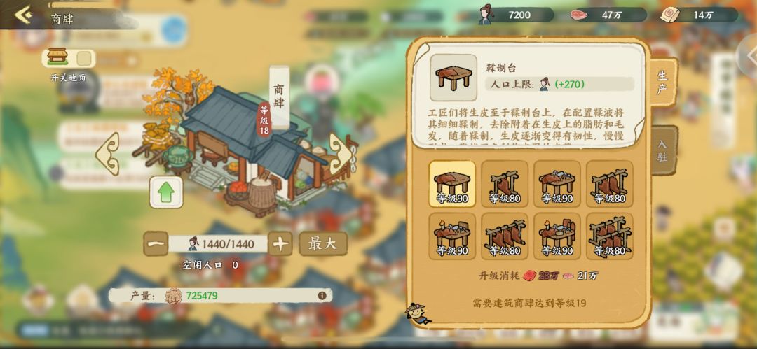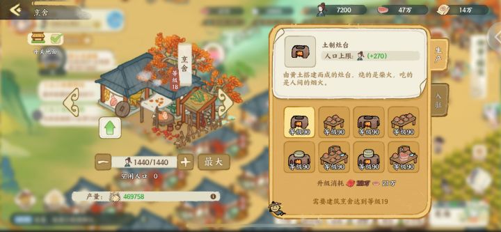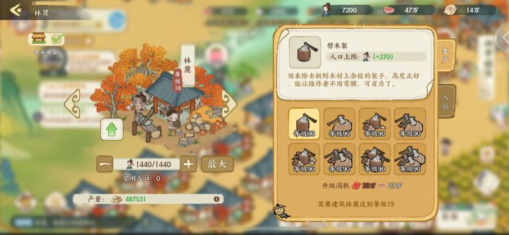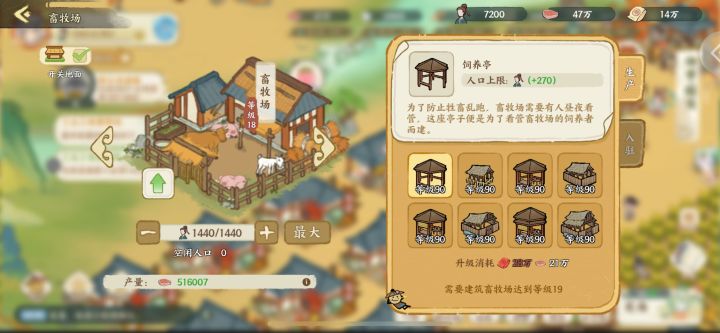 只有优先粮肉才能让建筑的工艺更上进度,不然空有等级是不加任何产出的,只多了20人口