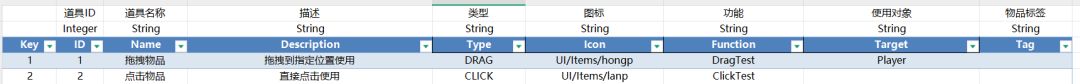 我们采用配置表的形式,在程序中读入道具配置信息。道具配置表里重点包含了道具的使用类型,功能类型以及使用对象。