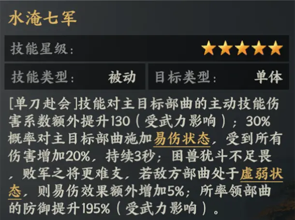 关羽的兵书【水淹七军】则能对目标施加易伤,若目标已处于虚弱状态,易伤效果还将进一步提升。这与张飞的虚弱形成高度配合!