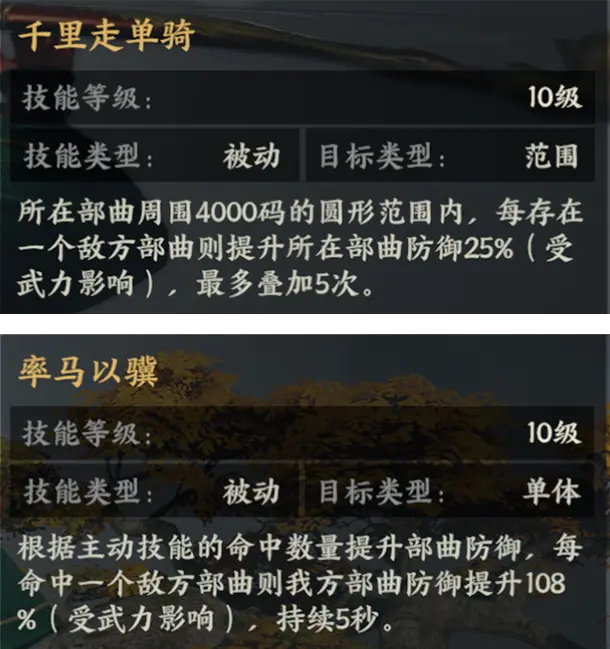 关羽的被动【千里走单骑】能在团战中获得巨额防御加成,【率马以骥】也根据技能命中数量提升防御,让部曲能在乱军中屹立不倒。