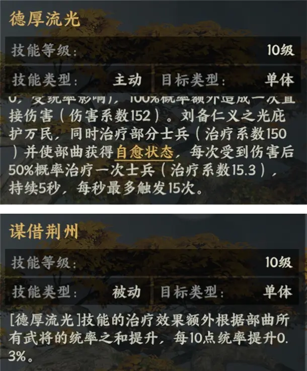 刘备的主动技能【德厚流光】可在造成伤害的同时治疗自身部曲,被动【谋借荆州】更能基于统率大幅提升治疗效果,为队伍提供了稳定的续航支持。