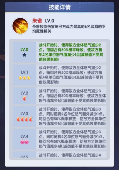 朱雀升至 6 星后,将解锁 “开局对敌方全体施加减 3 点怒气” 的核心效果。