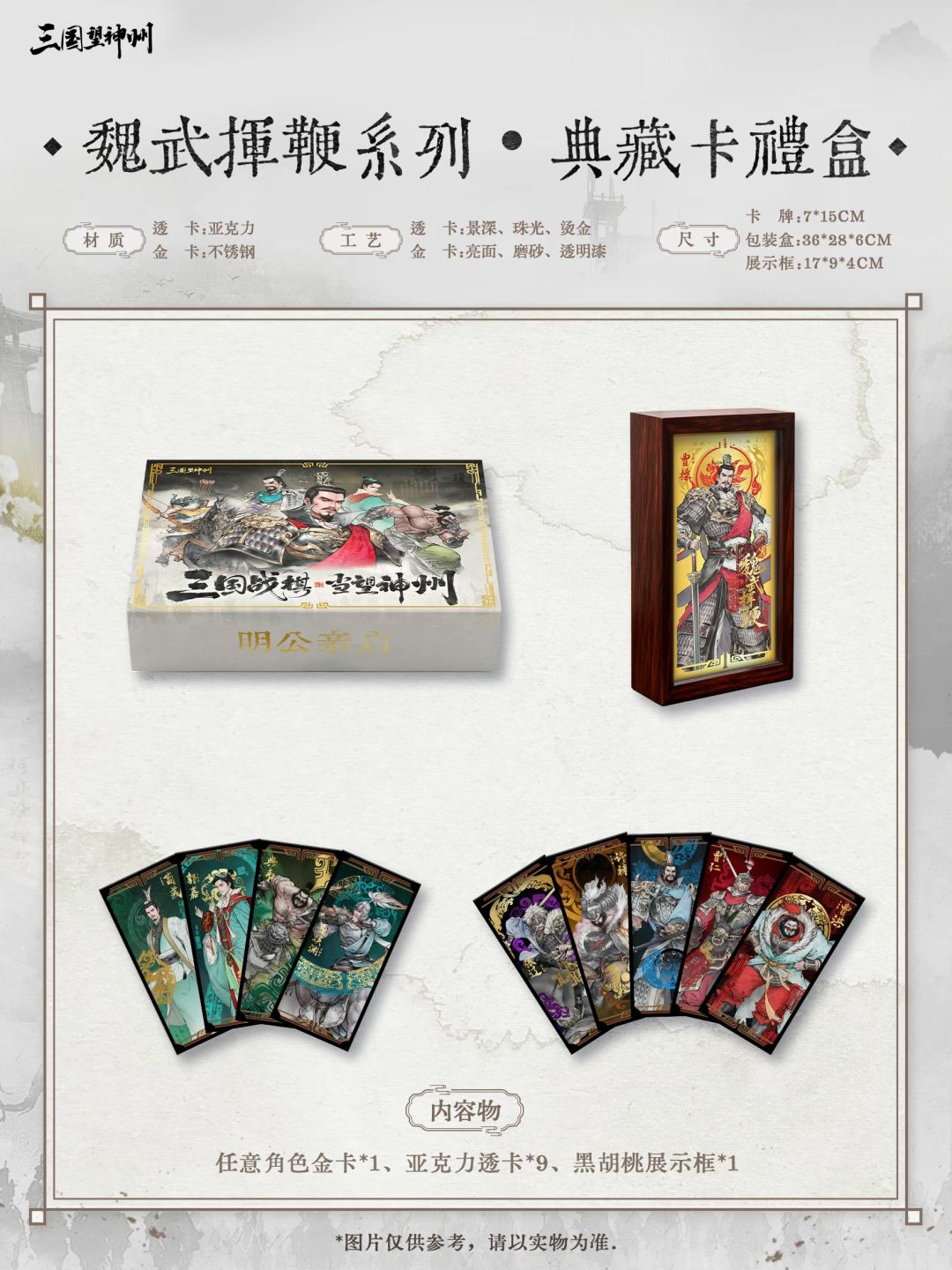 【典藏卡礼盒】分为「匡扶汉室系列」与「魏武挥鞭系列」,礼盒内包含「任意角色金卡*1」、「亚克力透卡*9」、「黑胡桃展示框*1」。精心制作,只为不负明公期待!