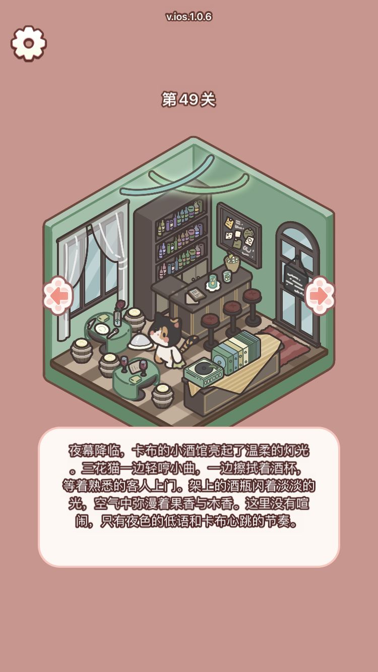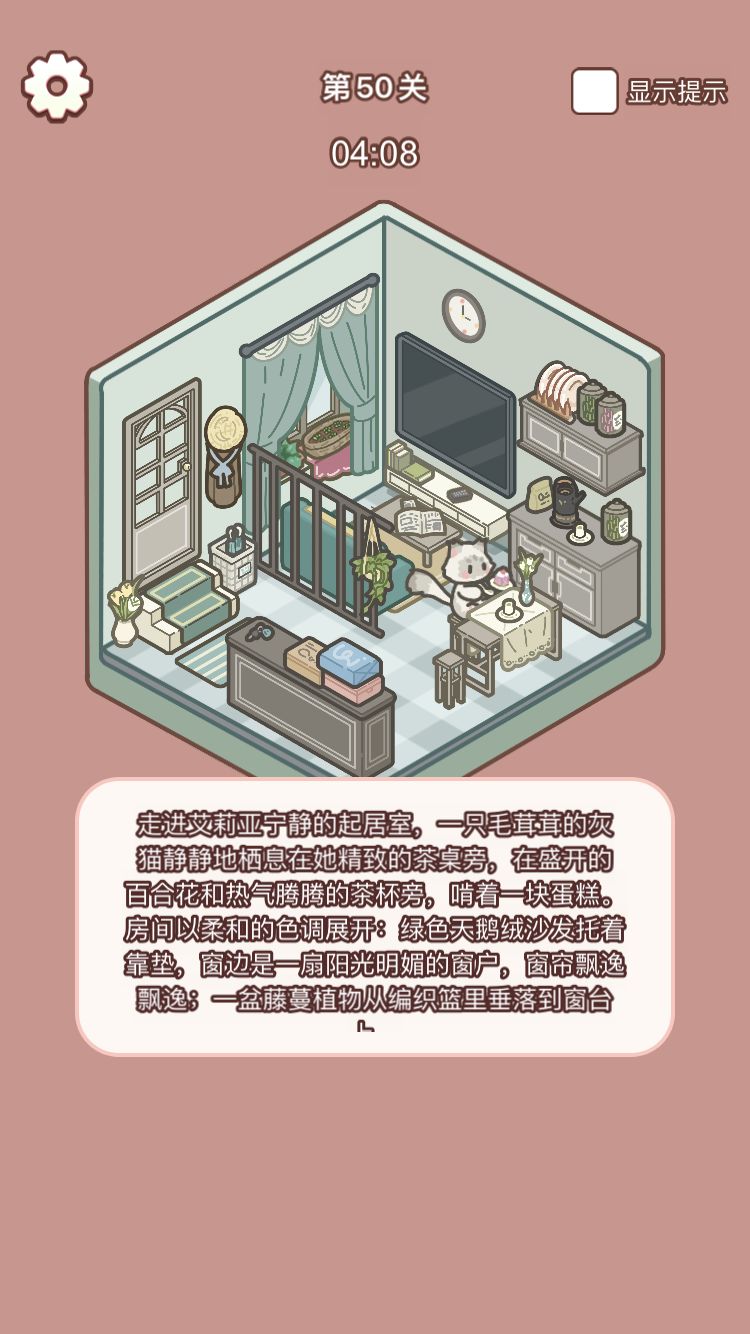 总体来说可玩性很高 但是小物件会出现已经放到本该到了的地方但是没有过去的情况 画风很好看 玩法比较单一 打发打发时间是一个很不错的选择有些物品可以不用按照常规思路去摆放遇事不决上墙试试 什么时候再多来几关