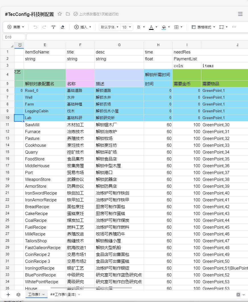 然后科技配置就通过Excel让数值策划配就可以了,程序方面则可以使用工具将Excel数据转为JSON,然后程序就可以读取json数据来解析科技树的配置啦~另外这里我使用的Excel转Json工具是Luban。