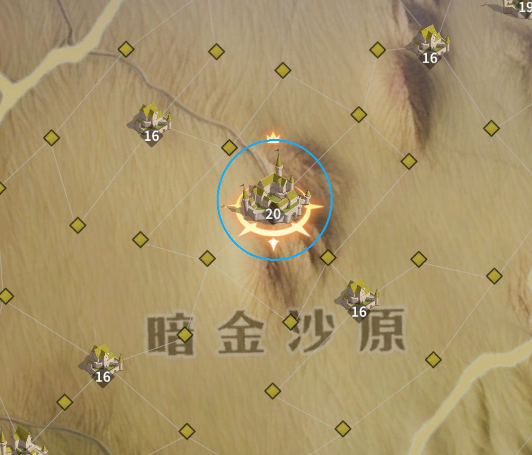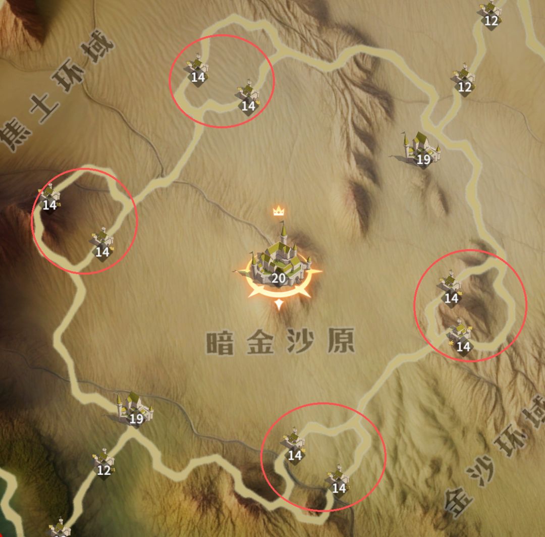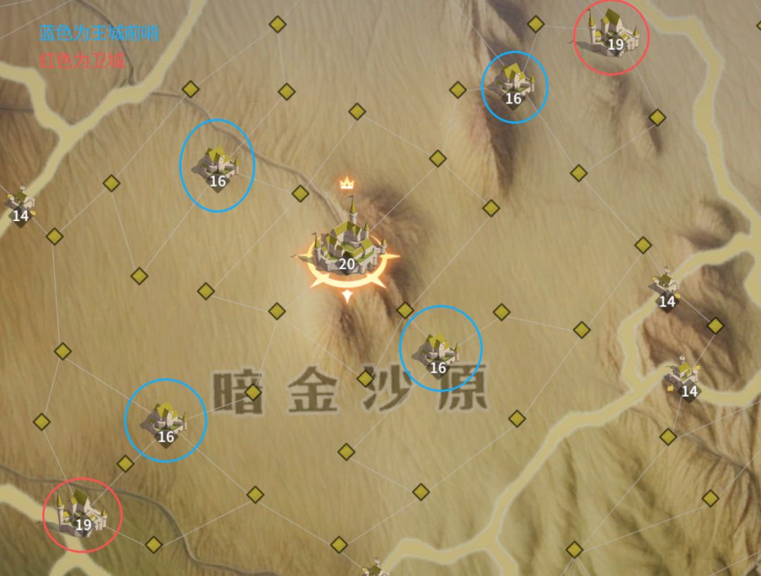 战略建议:从关隘触发,围绕两座卫城,四座王城前哨16级城展开争夺。尽可能控制距离王城较近的据点。