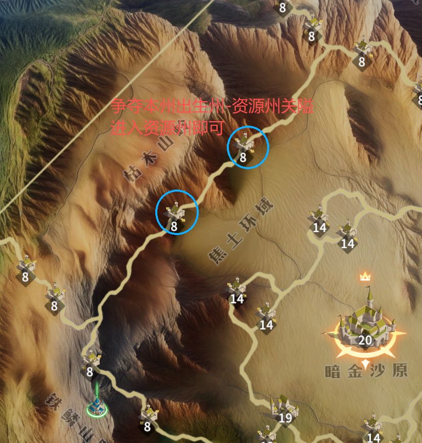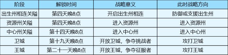 战略建议:此时会开启出生州关隘和资源州关隘,由于地图中低级城池意义较低,一般建议直接步入资源州,出生州只做防守和支援即可。