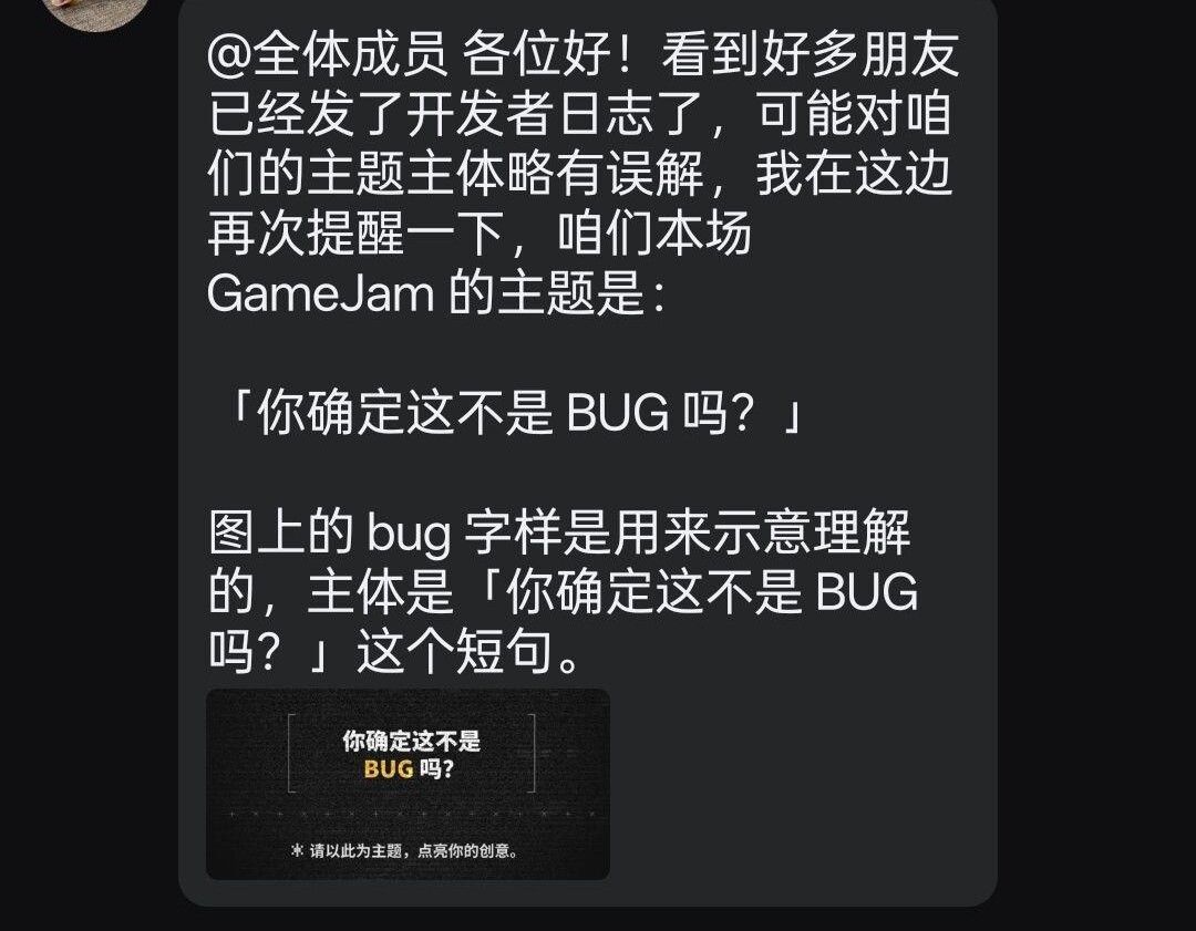 后来确定主题实为“你确定这不是bug吗?”,官方下场提示,说明11号前论坛里也许大部分方向是错误的,偏离了主办方的初衷,且并未让主办方感觉到是出乎意料的可取的创意。