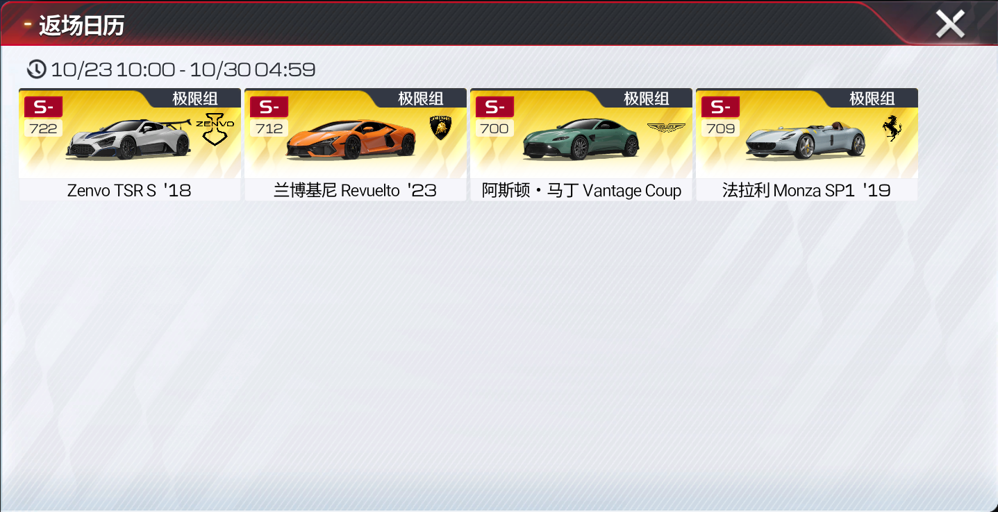 返场车辆:【极限组】传奇车辆Zenvo TSR S '18、【极限组】传奇车辆兰博基尼 Revuelto '23、【极限组】传奇车辆阿斯顿·马丁 Vantage Coupe '23、【极限组】传奇车辆法拉利 Monza SP1 '19