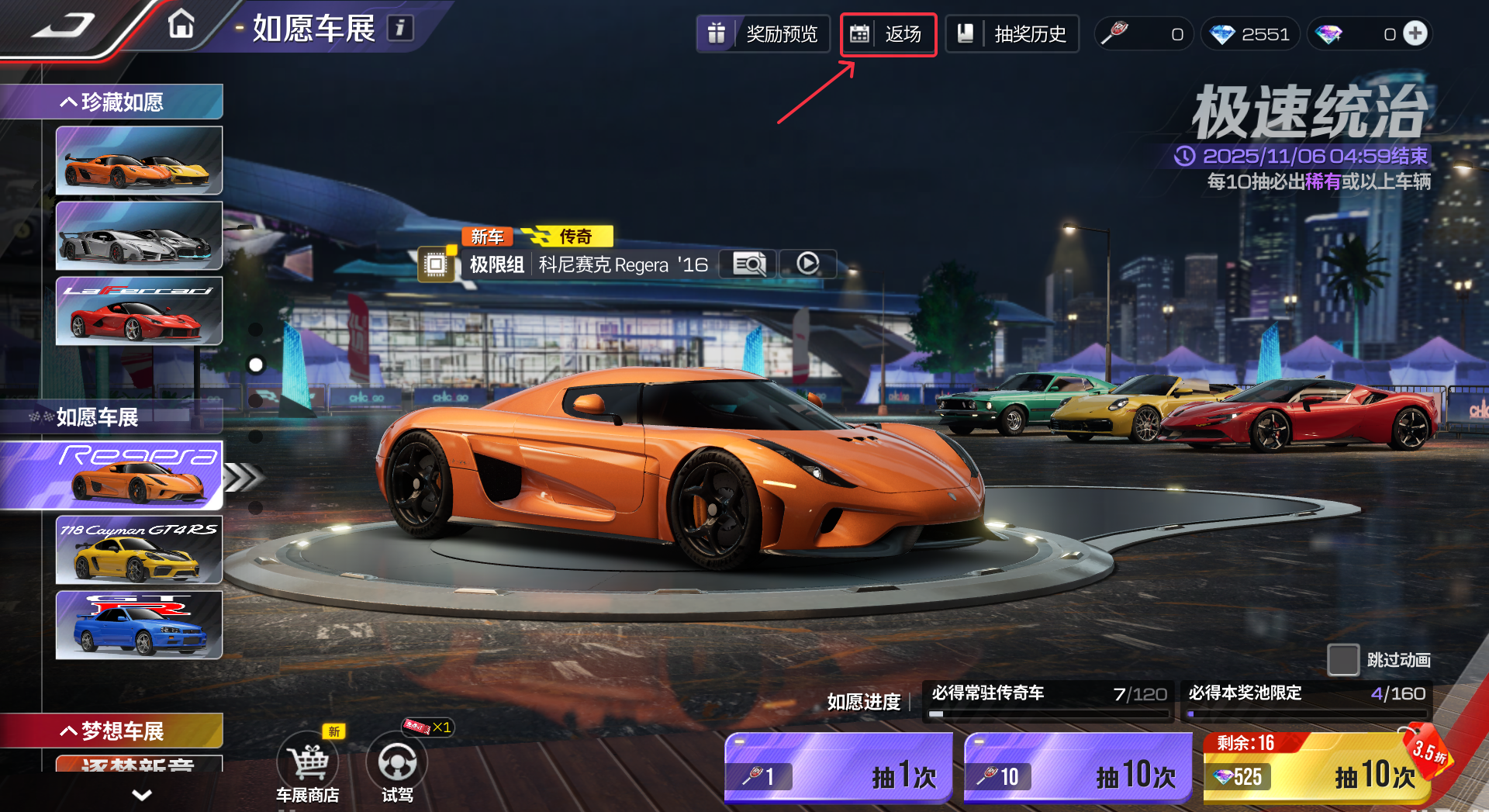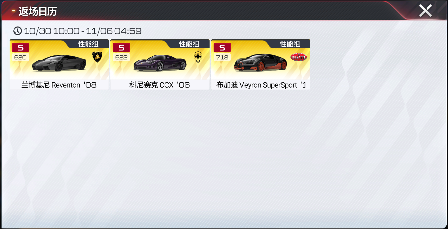 返场车辆:【性能组】典藏传奇车辆兰博基尼 Reventon '08、【性能组】珍藏传奇车辆科尼赛克 CCX '06、【性能组】珍藏传奇车辆布加迪 Veyron SuperSport '10