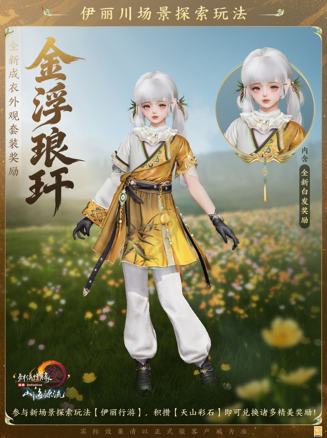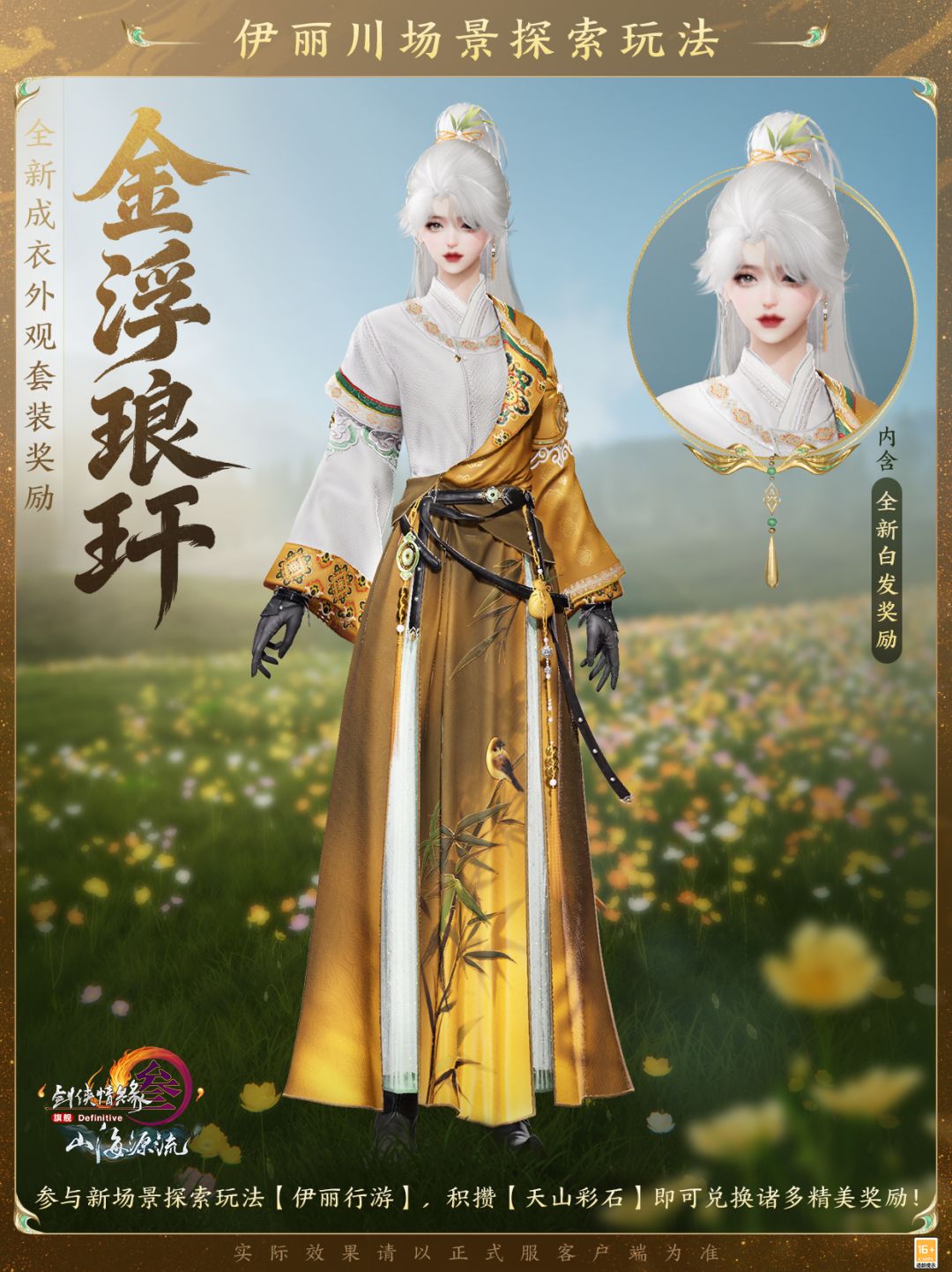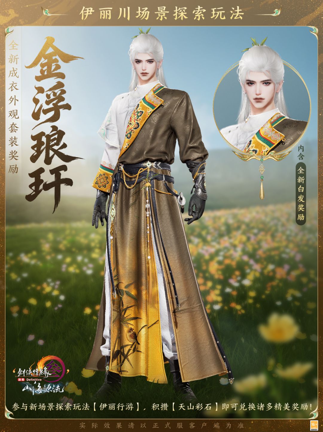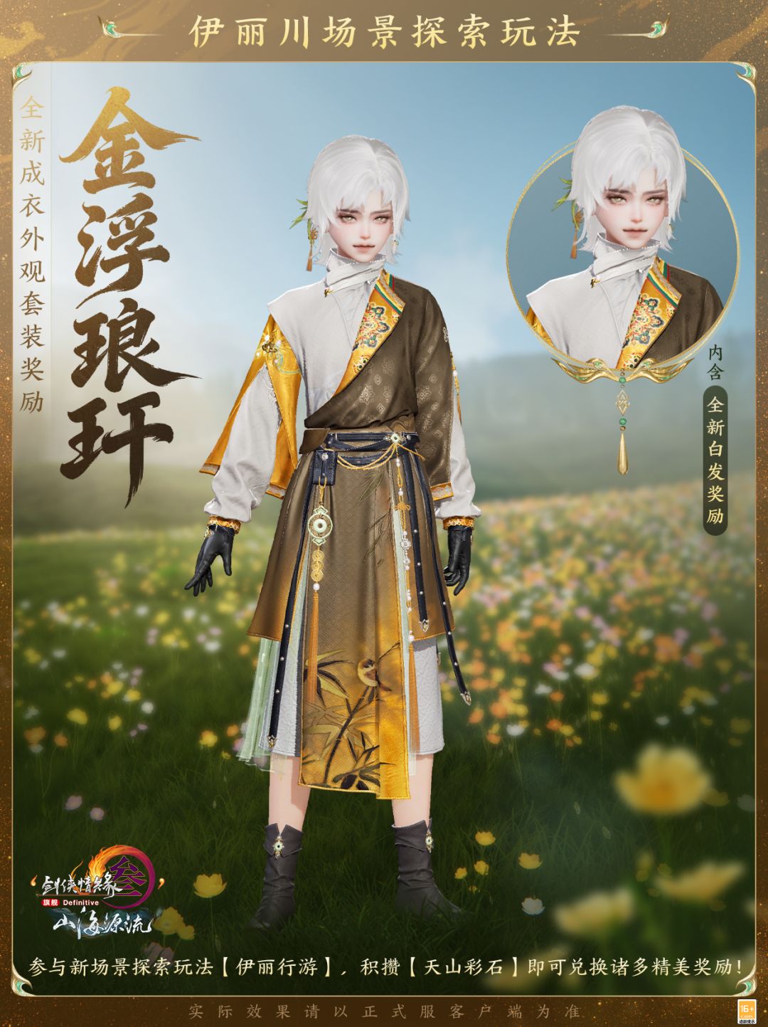 全新成衣外观套装奖励“金浮琅玕”内含定制外装与全新白发,取意自北疆广袤天地的民族风情,利落剪裁勾勒灵动身姿,肆意不羁,朗逸自生!