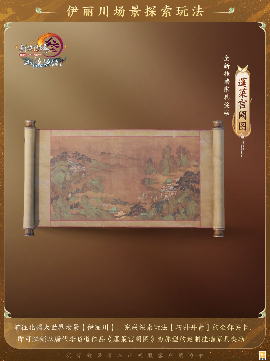 除此之外,还有全新挂墙家具“蓬莱宫阙图”等更多奖励将在新资料片上线后与侠士见面,让我们一同奔赴伊丽川,踏上新的旅途,体会更多欢乐!