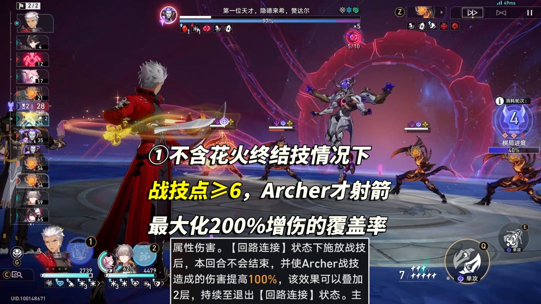 ①战技点(不含花火终结技)≥6,Archer才射箭,这样才能最大化天赋叠加的增伤效果,否则普攻等下次行动,确保让尽可能多箭矢吃到200%增伤。临近收尾刀倒不必如此强求;