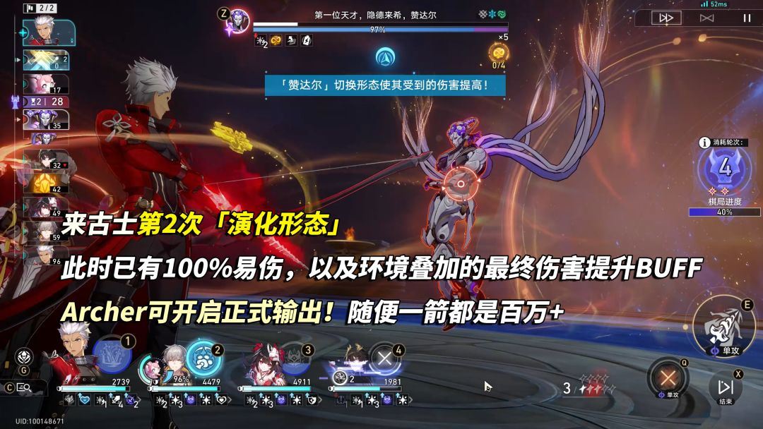 ③第2次「演化形态」,此时来古士身上已有100%易伤,Archer开始对来古士输出,至于其他3位队友依旧可选择打泰坦眷属得能量。