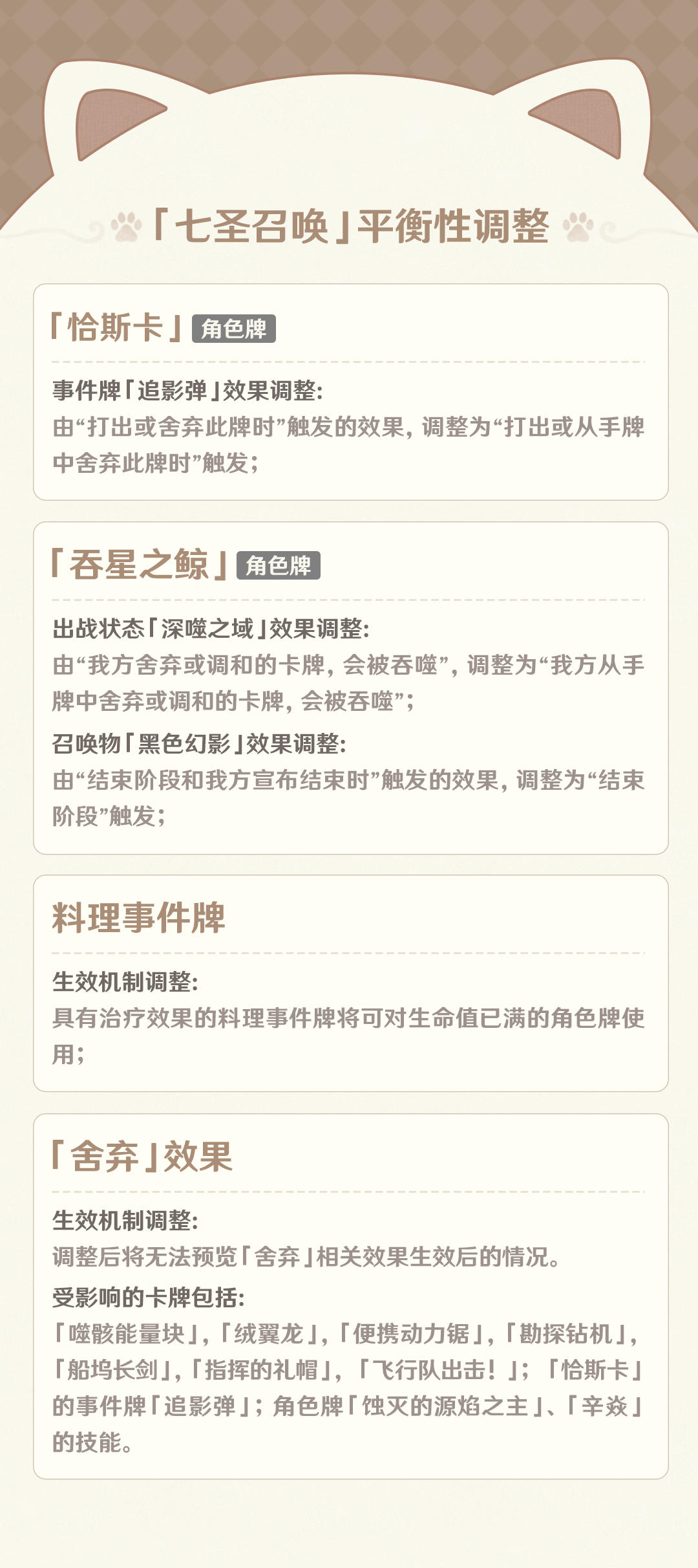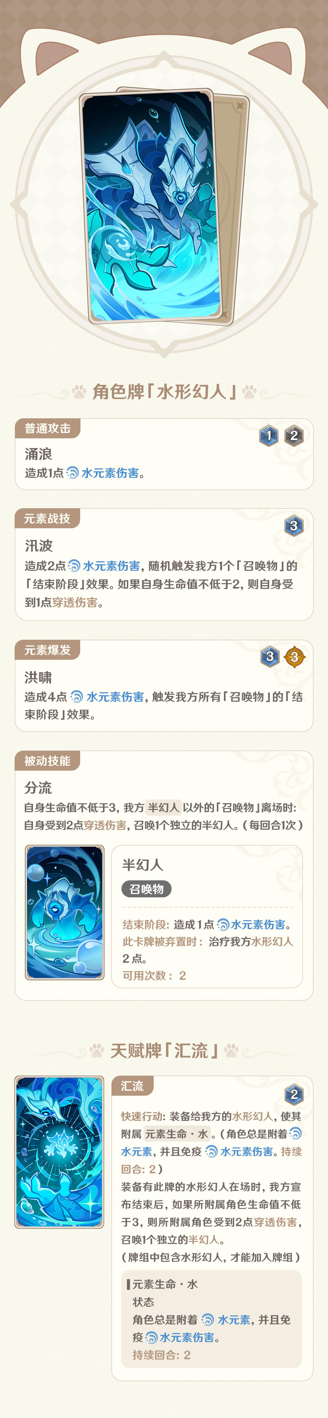 旅行者好呀,「月之二」版本更新后,「七圣召唤」玩法将新增角色牌「瓦雷莎」、「伊法」、「水形幻人」和对应天赋牌,以及六张新的行动牌,还有部分卡牌平衡性调整,一起来看看吧~