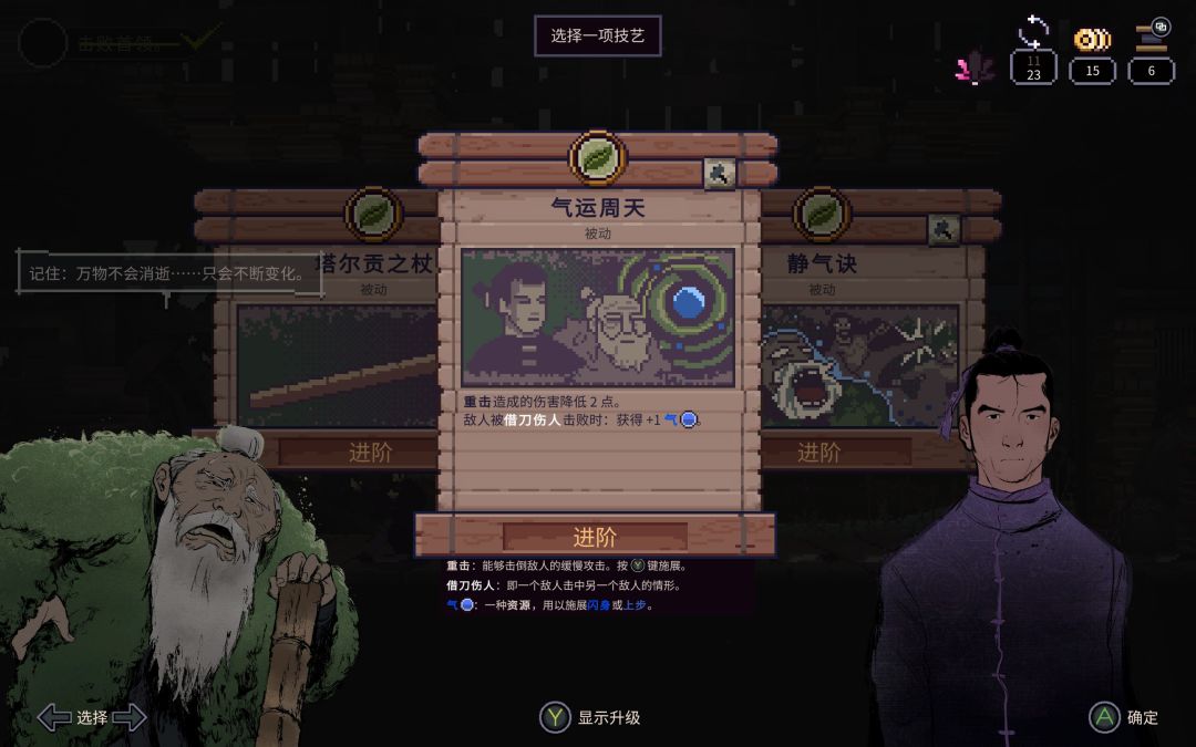 战斗初玩看起来很无聊,就是一个2D平面上的格斗,其实稍微深入就会发现,其核心是如何利用资源来防御、攻击敌人的策略体验,比如有一点气,你就可以用闪避躲过敌人攻击,没有就要被打,在Rogue模式加持下也更具可玩性,比如你学习了将别人投掷的武器接下的节能,便可以同时省下一次防御和攻击资源。