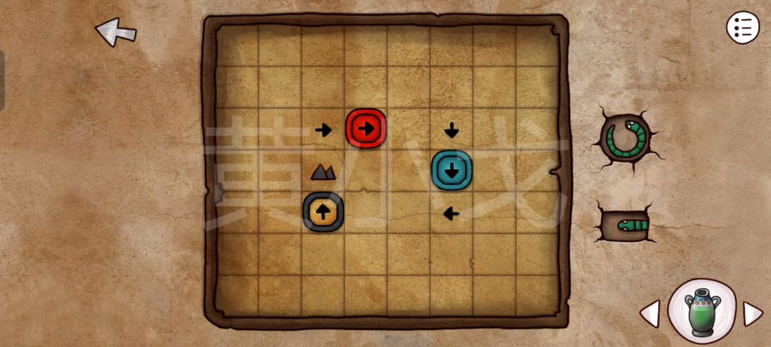5.点击神庙门上的密码锁,根据[码头-等候区]漂流瓶中的纸条上的图案线索,调整对应图案滑块的位置,打开门