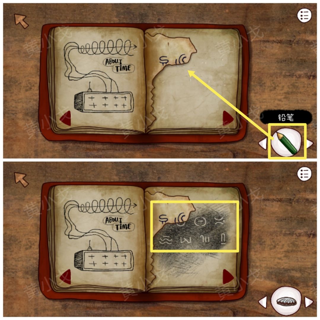 1.对笔记本撕掉的那页使用【铅笔】,获得符号线索