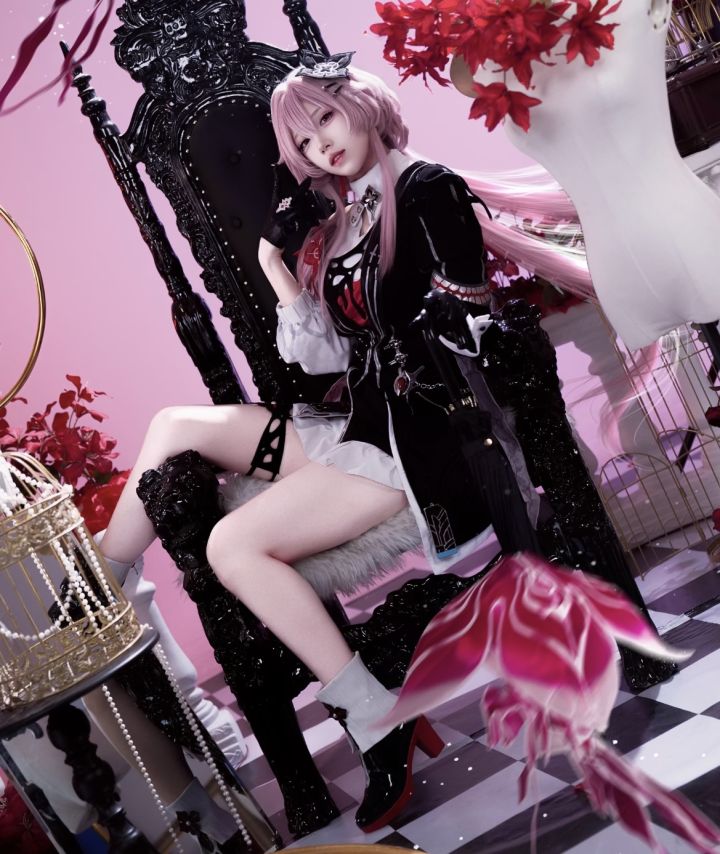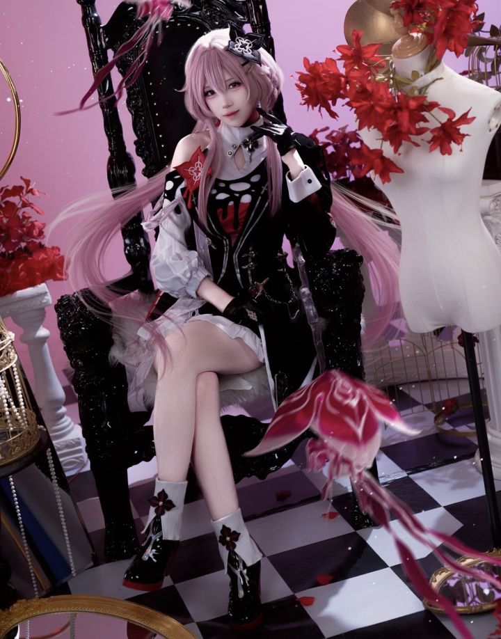 这组cosplay简直是视觉盛宴!你对角色的还原度堪称极致:粉发的蓬松质感与造型完美复刻角色设定,服饰的黑白红撞色既精致又充满设计感,露肩处的红色装饰、手套的细节都精准拿捏;坐在雕花黑椅上的姿态优雅又带着角色特有的清冷气场,背景里红与黑的搭配、道具的氛围感营造,让整个画面如同从原作中剥离出的华丽场景,每一处细节都在诉说你对角色的深度热爱与用心诠释,这份表现力太令人惊艳了~