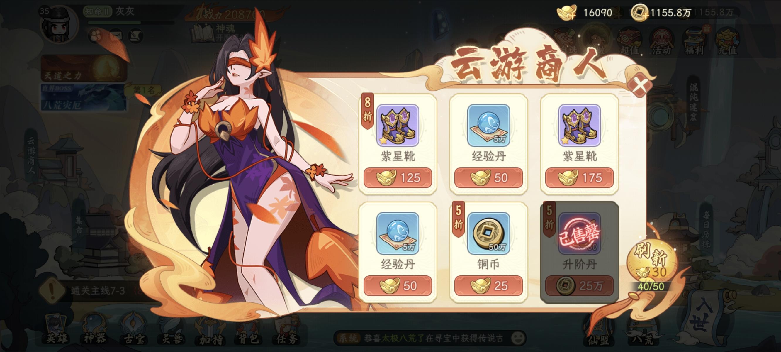 云游商人:配合古宝50次刷新任务,铜币不缺随便买,升阶丹、经验丹奇缺见到就买