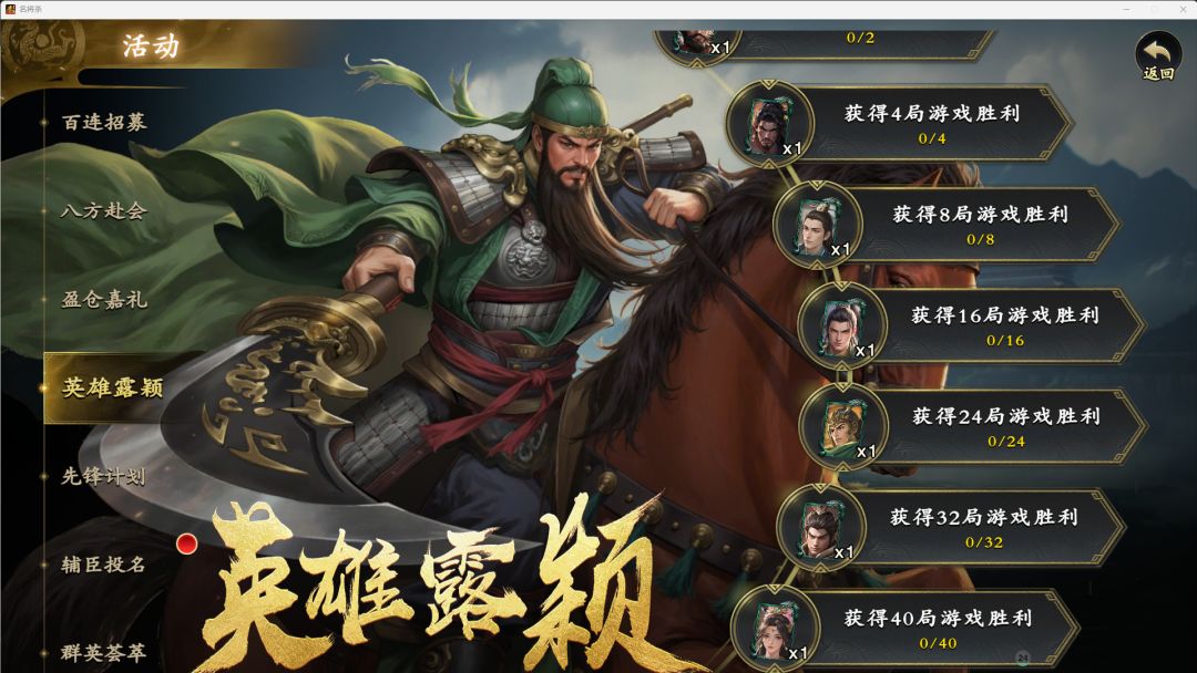 接下来“活动——英雄露颖”:胜利40场可以获得关羽、张飞、典韦、荀彧、孙策、周瑜、吕布、貂蝉等8个武将。在获得开局3个武将后,建议直接进“战役——武侯讲武”做一下胜利40场的任务,到这里总获得11个英雄了。