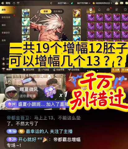 最近杨总复播,再次开启了他的增幅之路,在本周他的粉丝“帝都霸总”准备了19个12胚子,准备让杨总直播时帮忙冲击13,也让大家看清了氪金玩家增幅也不是那么容易的