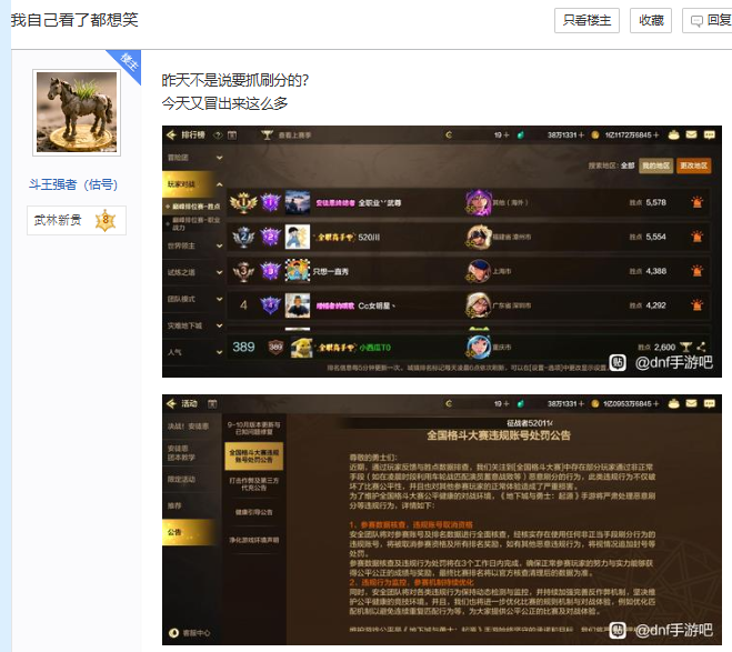 最近游戏内正在开展格斗大赛的决赛名额争夺战,名额会按照决斗胜点的排名选取,所以很多玩家就动起了歪脑筋,开始利用恶意刷分的行为上榜,本来刷分的情况还不严重,自从这周策划发布了要严惩刷分行为的公告,排行榜直接冒出不少一眼假的分数,截至10.18.2025,这些刷分玩家还在榜