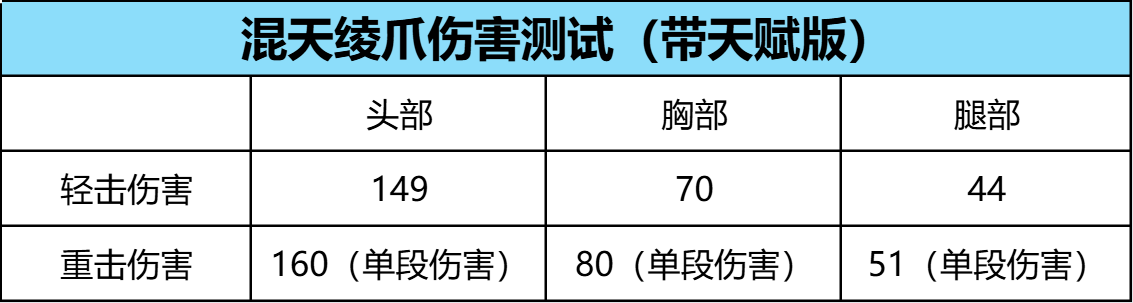 我们可以看到在数据测试方面,混天绫爪轻击伤害整体来说还是不错的,但是攻击速度方面是明显没有大多数近战武器快。而在重击方面,计算则是与其他武器不太相同,实战中命中敌方胸部时会造成80伤害,但是武器技能则将伤害进行分段表现,也就是实际对敌方造成160点伤害。