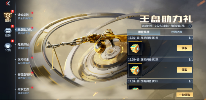 王者之盘即将重磅上架典藏飞行棋,枪身缠绕着整条闪耀金龙,视觉冲击力直接拉满。作为王者级武器,它不仅外观够吸睛,实战性能同样在线!更有福利助力礼,活动,只需完成登录、对局两项任务,就能总计领取7枚典藏之骰+3000钻石,助你更快解锁王者之盘。