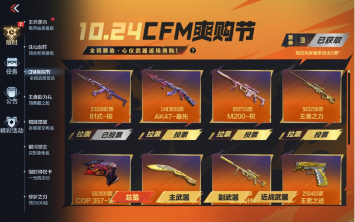 全民票选活动上线,让你决定哪些武器重返赛场,彻底实现返场爽够的心愿!每个人最多可投出5票,投给最想拥有的心仪武器。票池阵容更是诚意拉满,既有三国主力武器,81式-瑜、AK47-奉先、M200-权悉数在列,更有王者之力、王者幻神、王者之锋等高人气王者武器同台!赶紧拿起手中的票,为你念念不忘的武器投票!