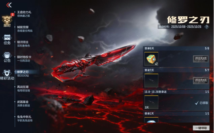 英雄级近战武器修罗之刃福利上线,零门槛就能抱回家!活动期间只需累计登录7天,不仅能直接拿下这把英雄级近战,还能同步领取3500钻石+2枚典藏之骰——钻石能囤货换道具,典藏之骰可冲飞行棋王者之盘。每天上线签个到,就能把英雄级武器和奖励道具一起收入囊中,千万别错过这波近战福利!