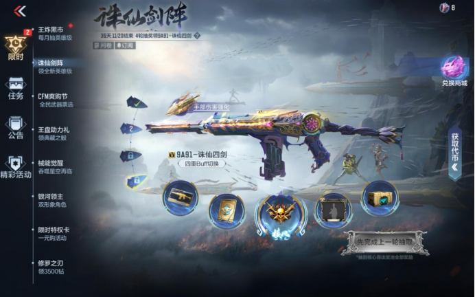 诛仙剑阵已开启最后一轮抽奖!你的9A91-诛仙四剑觉醒了吗?解锁强力专属技能“诛仙四剑”:切换剑匣分别触发命中躯干、头部、腿部、手部的伤害强化。让每一次射击都更具杀伤力,助你在战场上实力飙升!另外秦俑挂饰、秦铜盾挂饰隔一年返场,千万别错过!