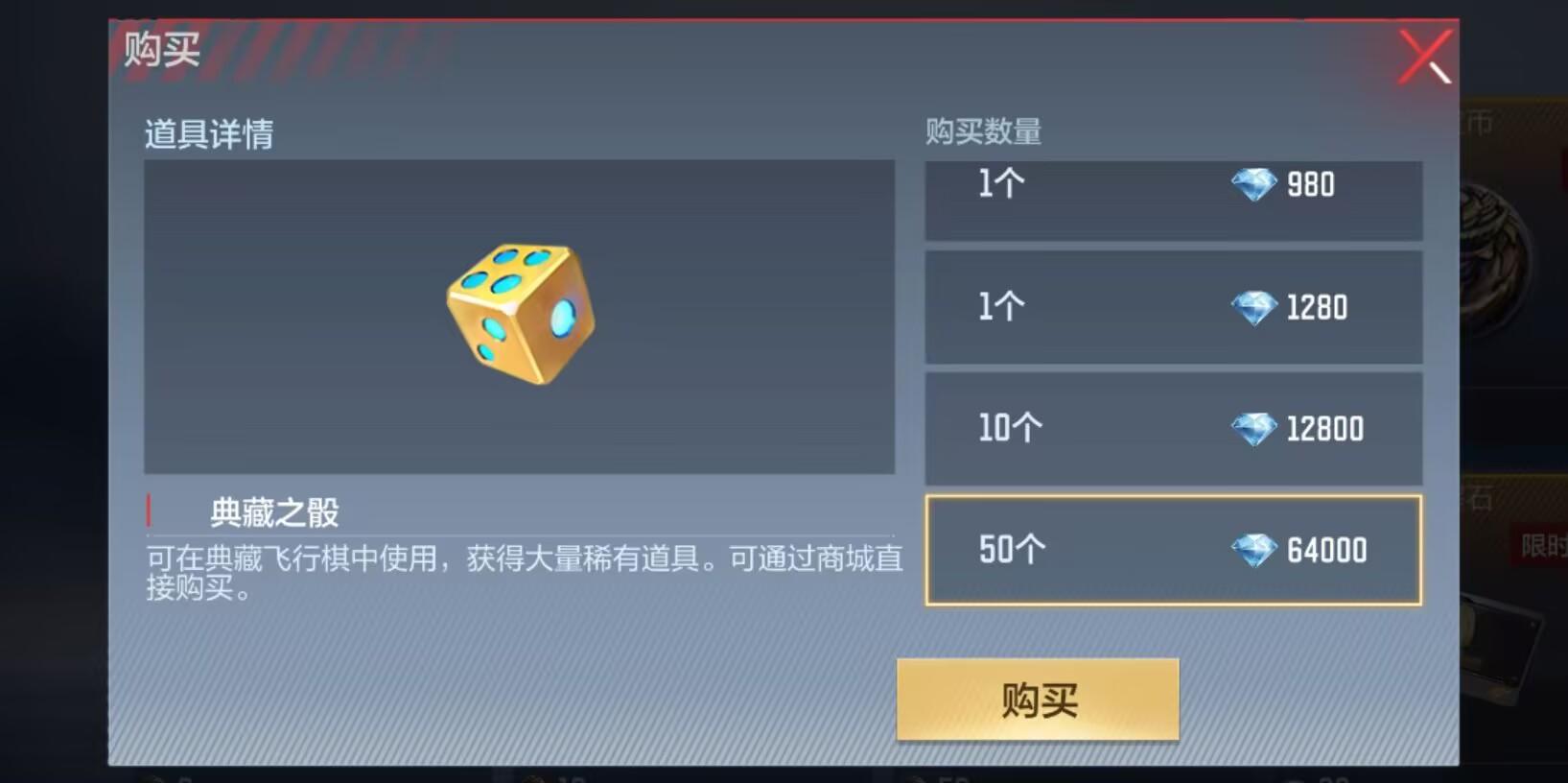典藏之骰是参与典藏飞行棋抽奖的唯一代币,1280钻石可购买一枚典藏之骰,而典藏飞行棋保底100抽必得终极奖励自选卡,也就是需要100枚典藏之骰,即128000钻石。