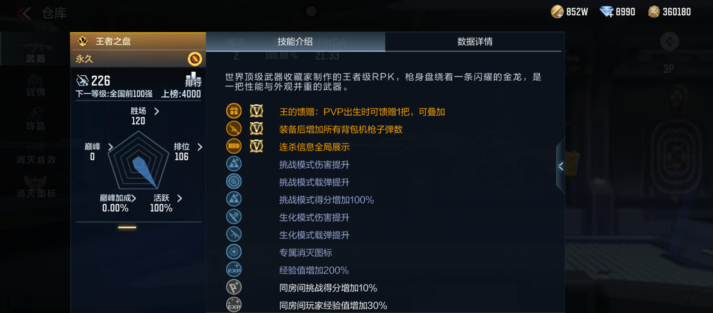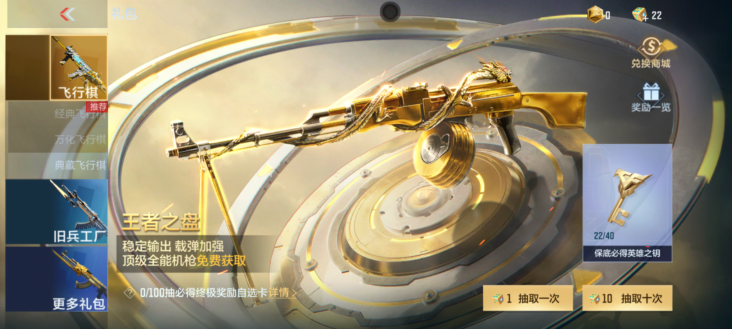 这么折算下来,一方面又是活动赠送典藏之骰,另一方面又是抽完典藏飞行棋,其中的宝箱还可以获得一些钻石,实际入手的价格大概在8万钻石左右,实际情况因人而异~【王者之盘怎么样?】王者之盘可谓一把全能机枪。在竞技模式中,600发/分的射速不算快,但是也不慢,甚至可以让机枪比较好操控;32点基础伤害加上无距衰,应用面很广;精度与稳定性的提升进一步提升操控性。