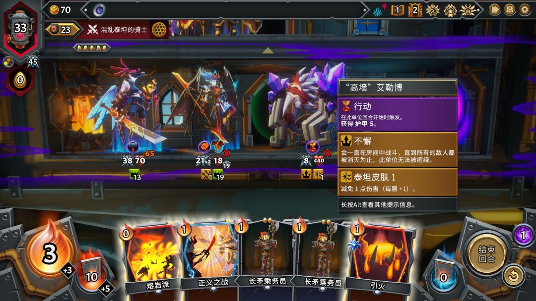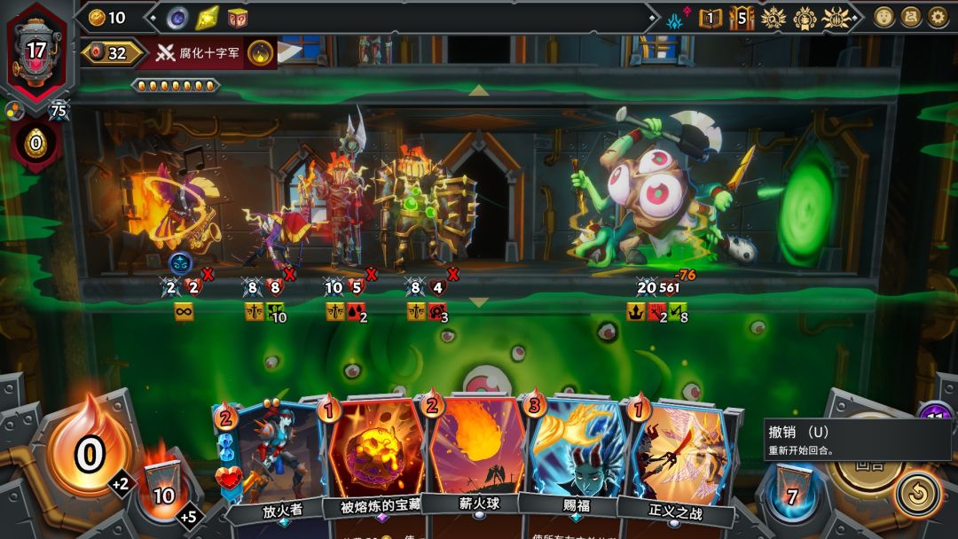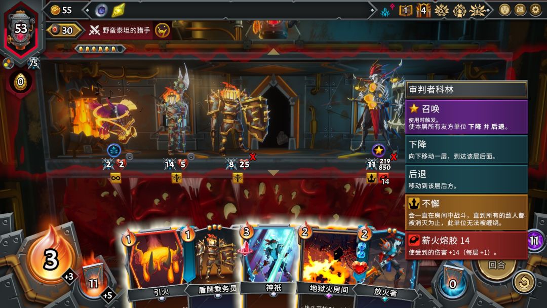 战斗的基础还是回合制的卡牌战斗,部署单位,使用不同的卡牌来获得增益,给敌人上负面BUFF等等,当然使用卡牌会消耗卡牌所需的余烬,类似行动力,归零之后就无法打出还需要余烬的卡牌。而战斗中只要击败首领就能获得战斗胜利,每个首领都有首领能力出现,影响战局并更具挑战性,在首领出现时可以查看王冠图标,比如不懈,会一直在房间中战斗直到所有敌人都被消灭。