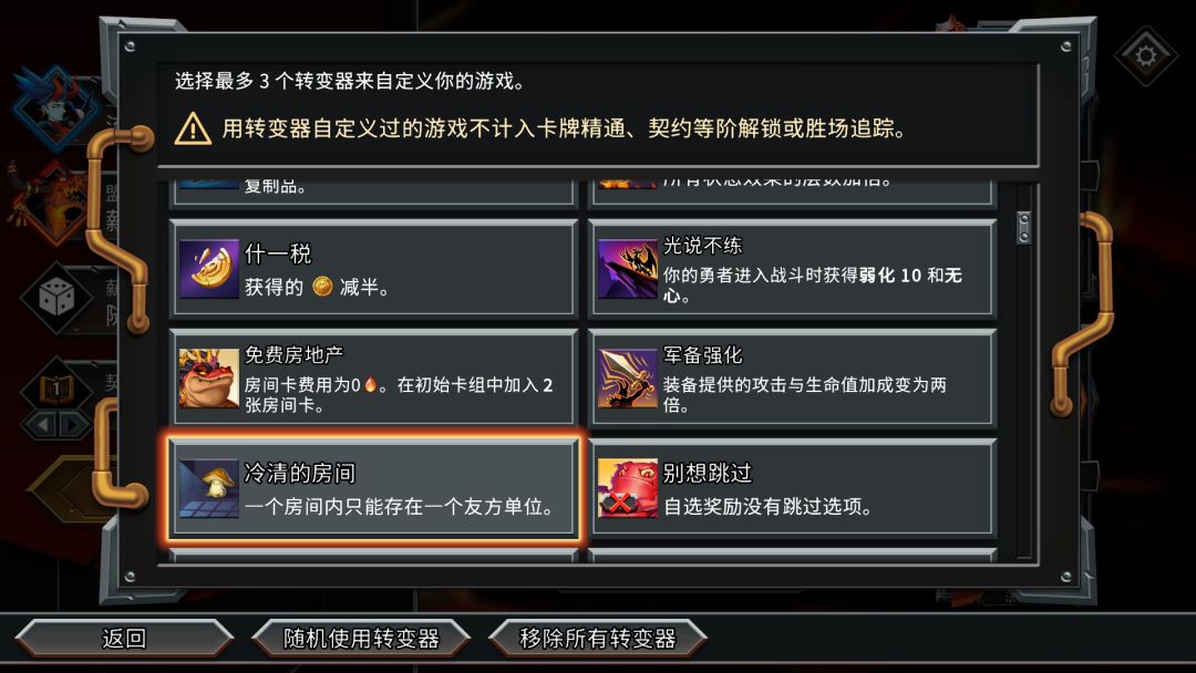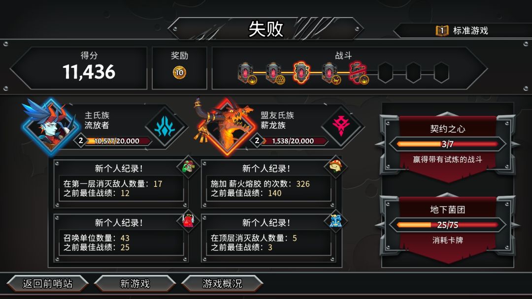 这次的五大氏族有流放者、薪龙族、月巫团、地下菌团和拉撒路联盟,初始前面两个氏族是解锁状态,后面三个需要特定条件解锁,然后就是薪火之心和契约等阶的调整,除此之外你还能添加转变器,但是使用转变器的游戏不计入卡牌精通、契约等阶解锁或胜场追踪。然后就进入熟悉的轨道界面了,注意你可以升级你的勇者和获得一件神器。