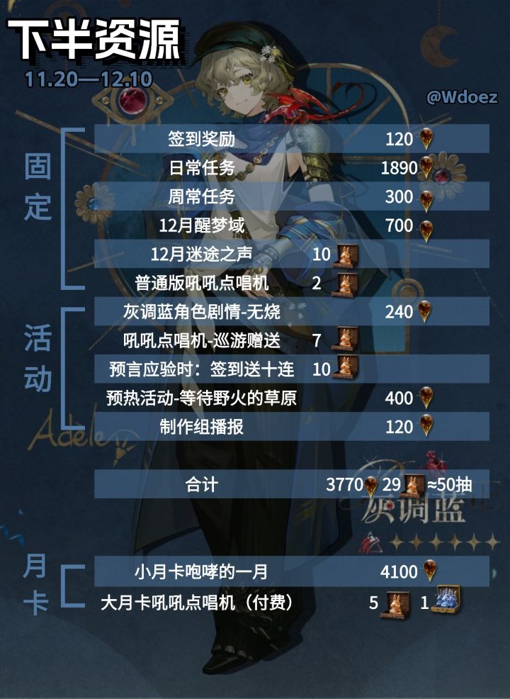 双月卡比小月卡多15抽而不是5抽是因为本次大月卡吼吼点唱机这次付费68元档(卡卡尼亚那个点唱机,不是送的旧的点唱机)额外送十全调·【湖的涟漪】x1,相当于直接多了10抽,但是注意这10抽只能在湖的涟漪使用。总体来说这次巡游版本资源是超过2.2版本的,而且活动剧情雨滴我是按照1200保守算的