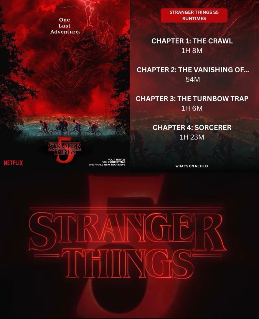该时长也印证了达菲兄弟此前对于该季"堪比八部大片"的形容。罗斯在网飞2025片单发布会上曾透露:“我们花费整年拍摄,积累超过650小时素材,这是最具野心的一季。"马特则动情补充: "这更是最贴近心灵的故事,与相伴近十年的演员们拍摄告别戏时,现场充满泪水与激情。"
