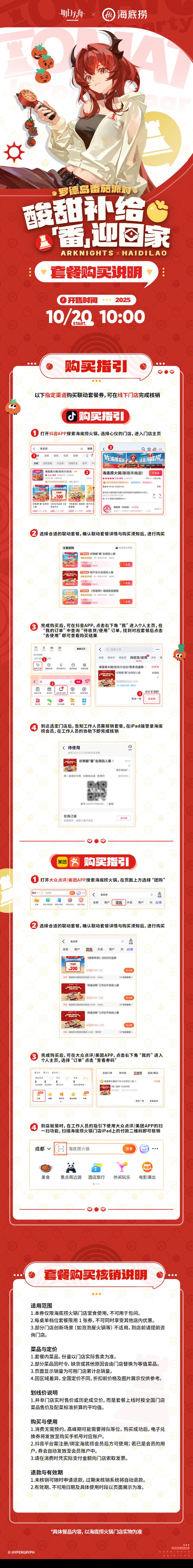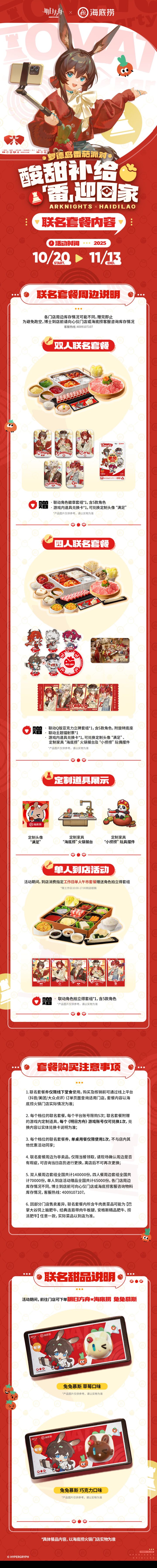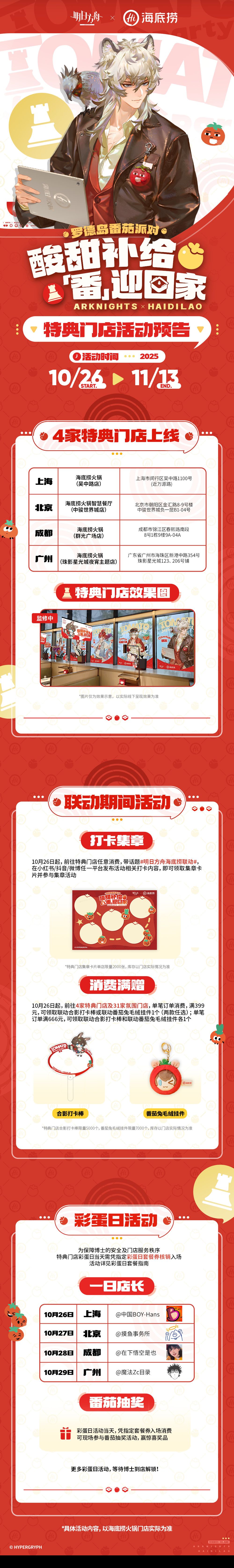 活动期间,海底捞门店下单番茄锅底,带话题明日方舟海底捞联动,在小红书/抖音/微博任一平台发布活动打卡、周边展示等内容后,可联系工作人员领取随机联动主题贴纸1款。