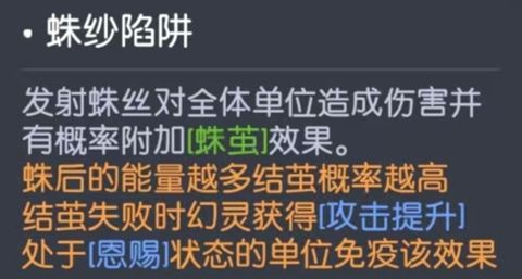 如上图,【蛛纱陷阱】技能有概率对幻灵附【蛛茧】效果,织命蛛后每有一点能量点可提示10%的概率,因此玩家需要及时净化或减少场上的【蛛卵】来减少织命蛛后的能量点,降低幻灵被强制控制的概率。【恩赐】状态的幻灵可免疫该效果,如果对某幻灵结茧失败还可以使其获得【攻击提升】的buff。